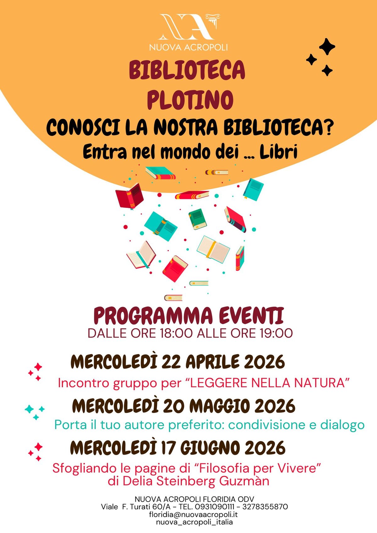 Tutti gli incontri si terranno presso la Biblioteca Plotino di Nuova Acropoli Floridia in Viale Turati 60/A. L'ingresso è libero e gratuito.