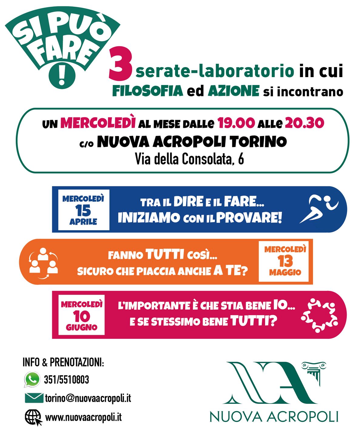 Vi aspettiamo numerosi un mercoledì al mese dalle 19.00 alle 20.30 presso la nostra sede associativa in via della Consolata 6, per sperimentare la conoscenza di sé in chiave filosofica.